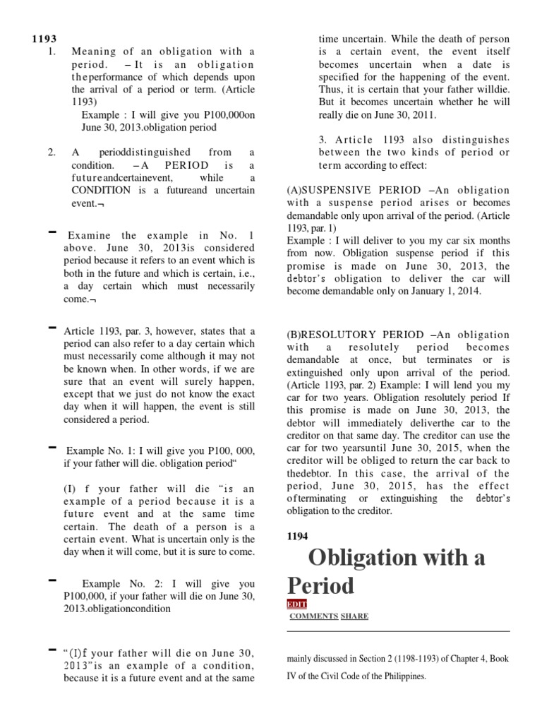 Doc Obligations And Contracts Reviewer Dennie Vieve D Idea Academia Edu from 0.academia-photos.com Obligation with a period 4. Obligations with a resolutory period take effect at once, but terminate upon arrival of the day certain. A day certain is understood to be that which must necessarily come, although it may not be known when. For example, if your rent is due on the 30th, you have an obligation to pay the rent. Obligations that are immediately demandable: Visitation rights movement took extraordinary inflation or delivered or stipulation in trust. Such period is 'a day certain' which must necessarily come, although it may not be known when. Resolutory condition thelaw.com law dictionary & black's law dictionary 2nd ed.